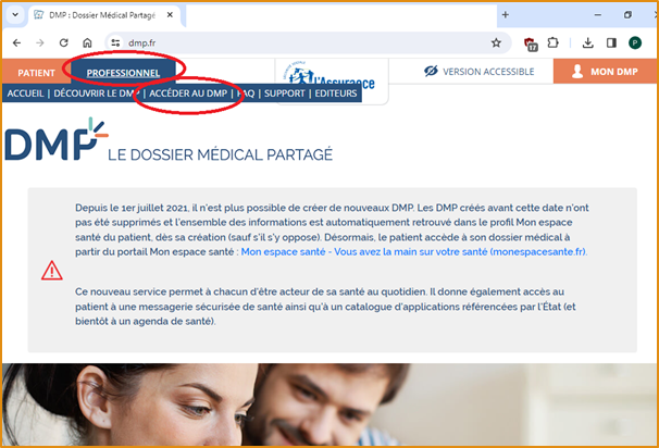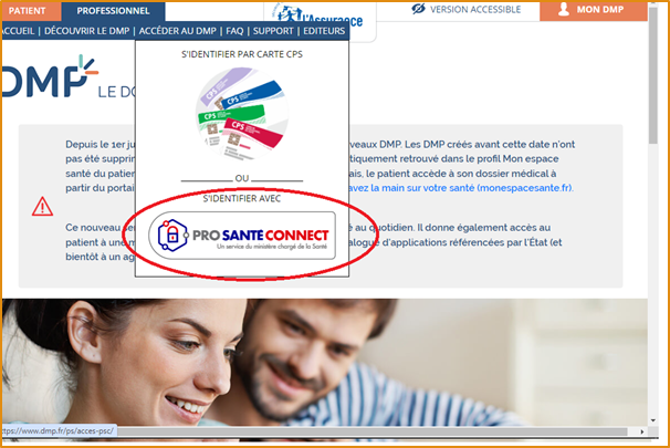 Sur sur le site du DMP, cliquez sur “Professionnel” puis sur “Accéder au DMP”.