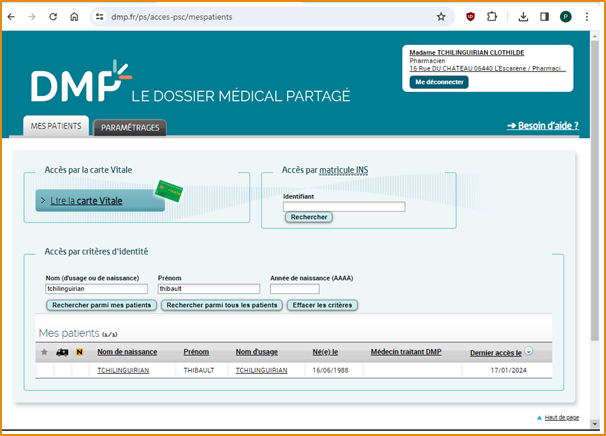 - soit via son identifiants numérique de santé (INS)
