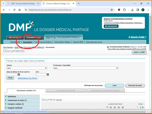 Une fois sur la page de DMP de votre patient, cliquez sur “Documents”. Cette section vous permet d’accéder aux documents présents sur le dossier de votre patient, et vous permet également d’en transmettre un nouveau.
