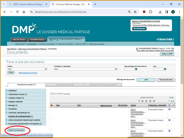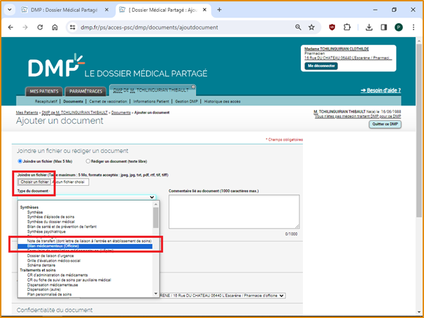 Cliquez sur “Choisir un fichier” pour transmettre le document depuis votre ordinateur. Puis renseignez le type de document. Dans cet exemple, nous choisissons l’item “Bilan médicamenteux (officine)”.