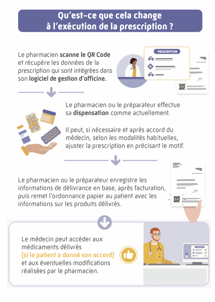 Cette sécurisation de l’ordonnance numérique permet une prescription et une dispensation simplifiées. Le scan du QR code par le pharmacien permet :