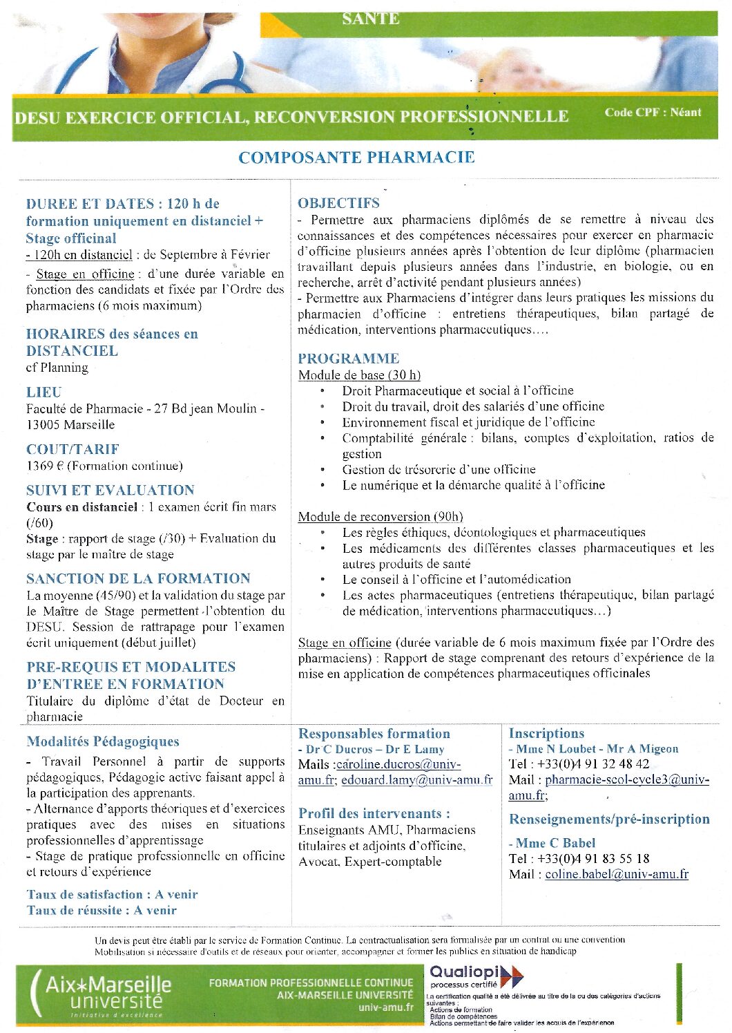 Formation dispensée par la Faculté de Pharmacie de Marseille, avec un suivi personnalisé et une mise en situation professionnelle.